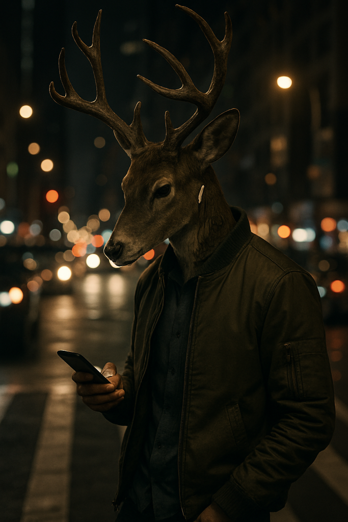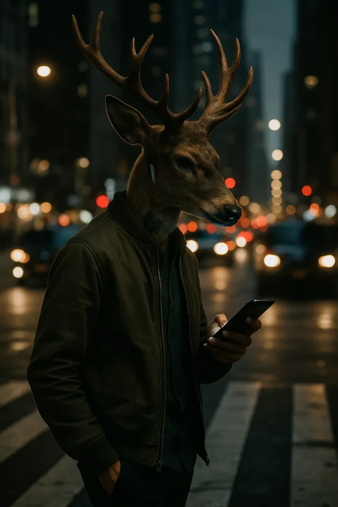 Wszyscy znamy ten widok: pędzące samochody, neony odbijające się w kałużach, tłum ludzi wpatrzonych w ekrany swoich smartfonów. A teraz wyobraź sobie, że w centrum tego chaosu, na przejściu dla pieszych, stoi majestatyczny jeleń. Nie jest jednak spłoszony. Na szyi ma subtelne tatuaże, w uszach nowoczesne słuchawki, a jego wzrok, podobnie jak nasz, utkwiony jest w ekranie telefonu.