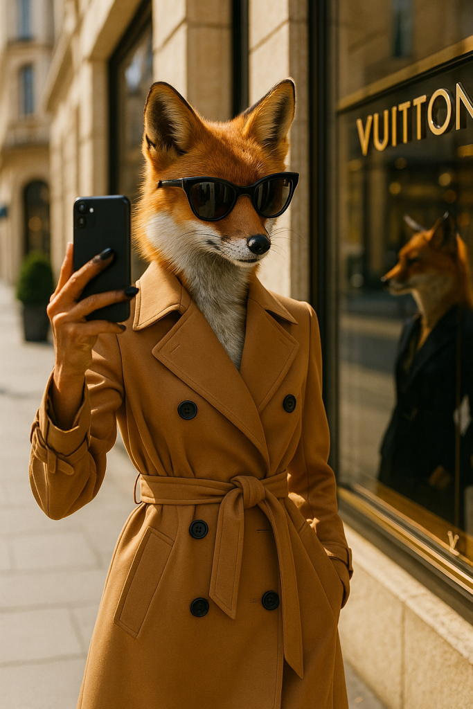 - Lisica-Influencerka: To ucieleśnienie kultury autokreacji i pogoni za luksusem. Jej selfie na tle drogiego butiku to satyra na świat, w którym wizerunek staje się ważniejszy od autentyczności.