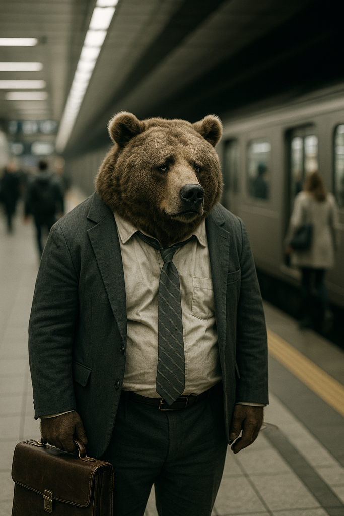 - Niedźwiedź-Biznesmen: Zmęczony, wymięty garnitur i pusty wzrok – to portret wypalenia zawodowego i codziennej harówki w korporacyjnym młynie, która odbiera siłę nawet najpotężniejszym istotom.